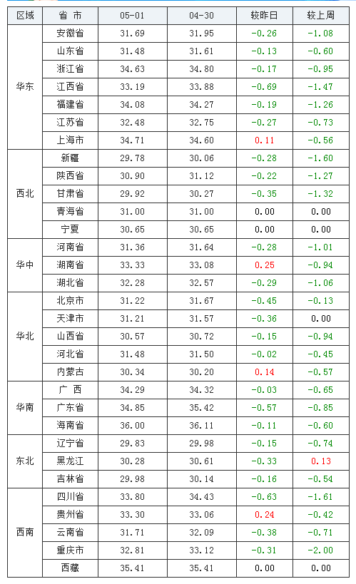 全国生猪均价(外三元)为32.19元/公斤,价格较昨日下跌0.24元/公斤;内三元生猪均价为31.43元/公斤,价格较昨日下跌0.13元/公斤;土杂猪生猪均价为30.86元/公斤,价格较昨日下跌0.26元/公斤;