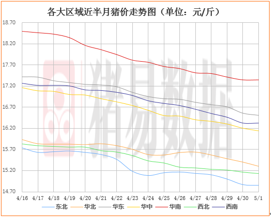 目前国内各大区域猪价差异化表现明显,华北、东北、西南、华东、华中、华南、西北地区猪价出现了一定幅度的下跌现象,整体猪价继续呈现下跌走势,东北局部出现反弹态势。