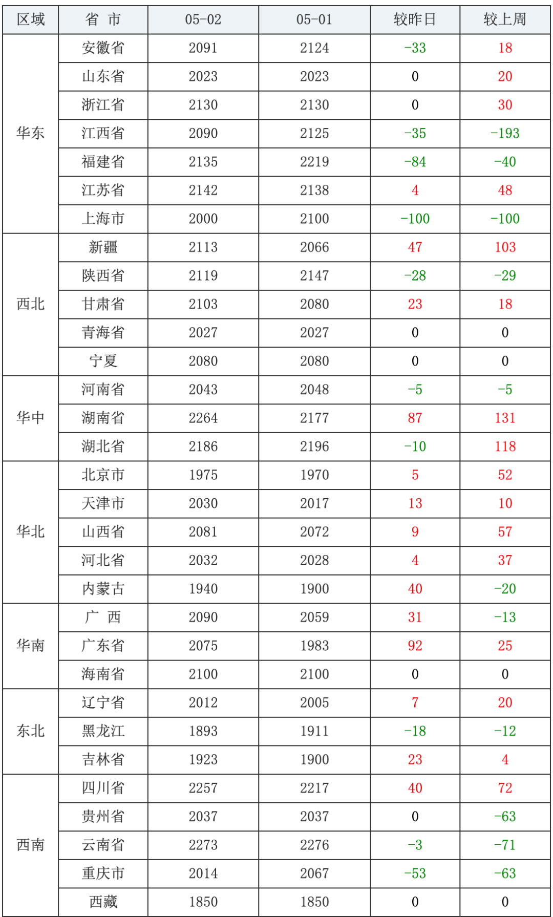 豆粕均价(43%蛋白)后五:西藏自治区2741元/吨、广东省3014元/吨、贵州省3017元/吨、福建省3043元/吨、广西壮族自治区3076元/吨、