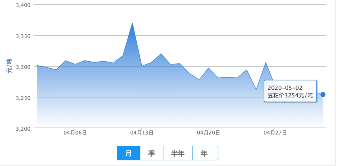 2020年05月02日,今日全国豆粕均价为3254元/吨,较昨日下跌5元/吨。近期玉米易涨难跌,总体稳中偏强运行可能性依旧偏高。在5月中旬前后,价格有望出现新的趋势。