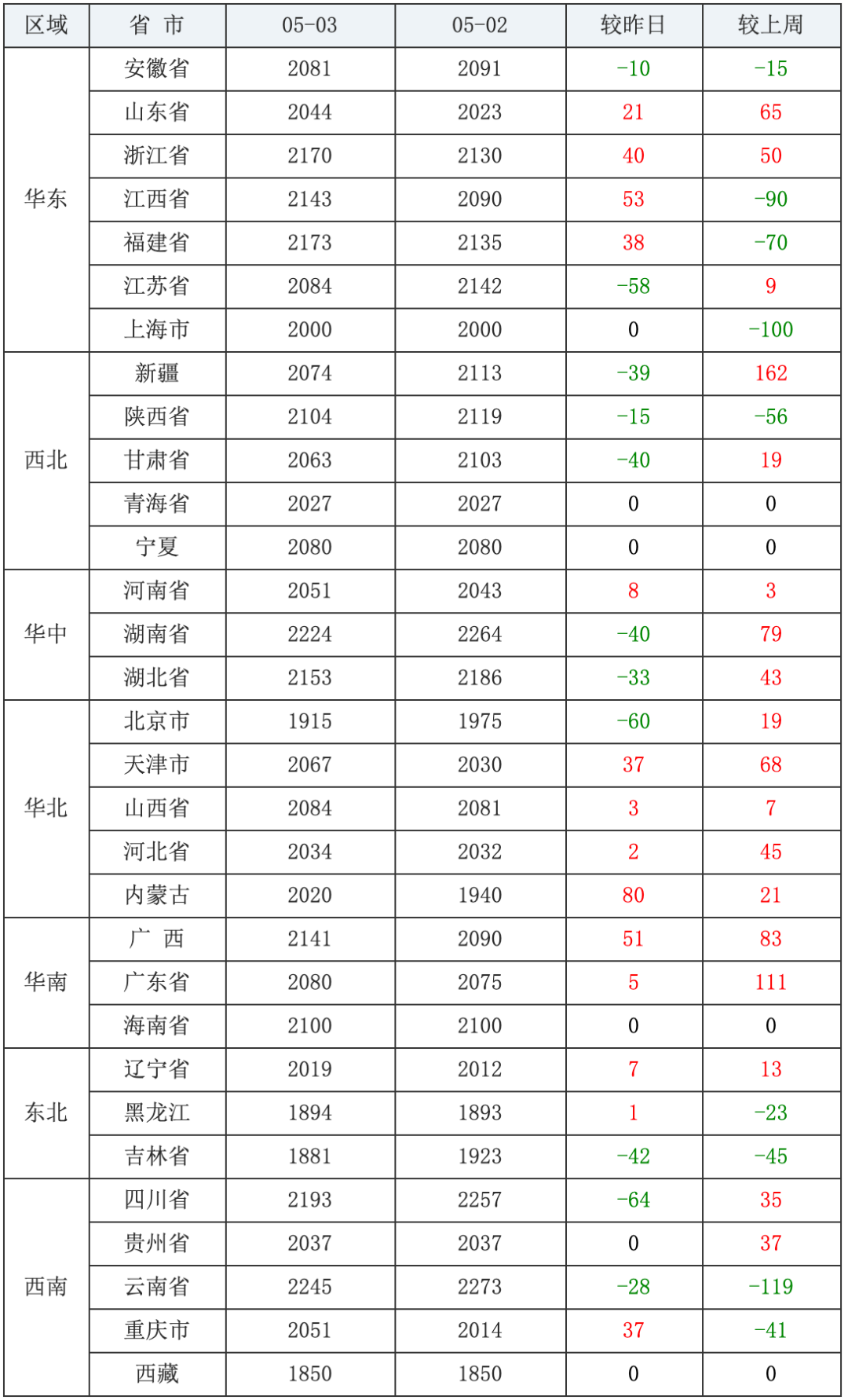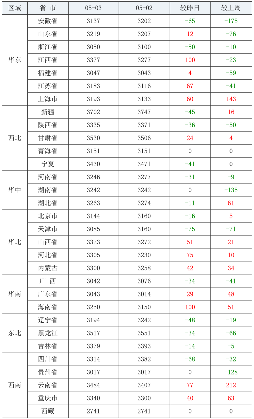 豆粕均价(43%蛋白)前五:新疆维吾尔自治区3702元/吨、甘肃省3530元/吨、黑龙江省3517元/吨、云南省3484元/吨、宁夏回族自治区3430元/吨。