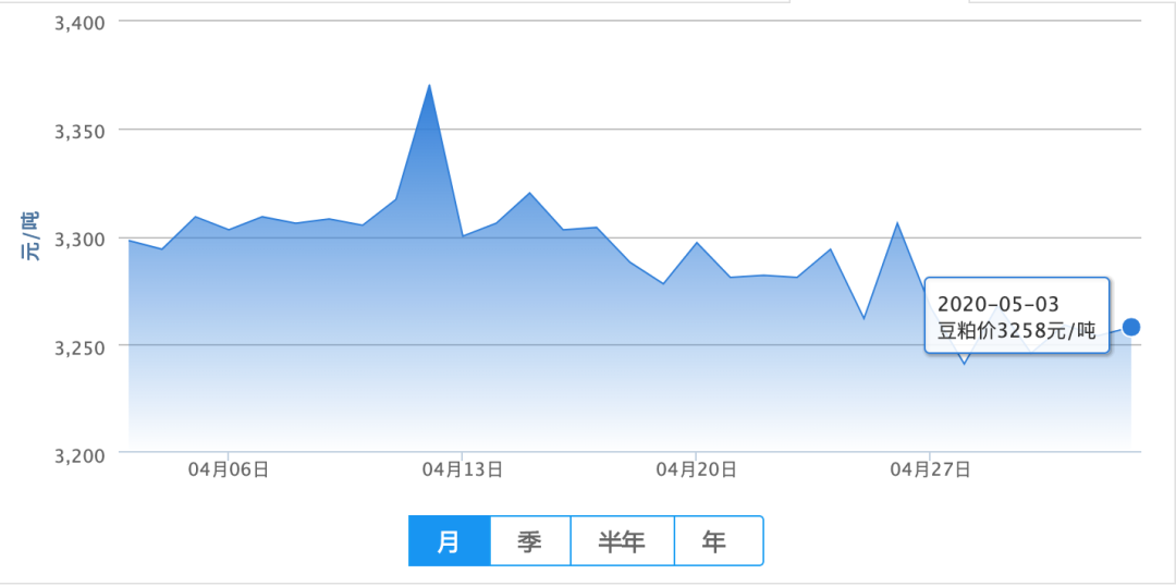 2020年05月03日,今日全国豆粕均价为3258元/吨,较昨日上涨4元/吨。豆粕现货供应相对紧张,支撑其行情,但后期大豆集中到港压栏渐增,豆粕或逐渐承压。