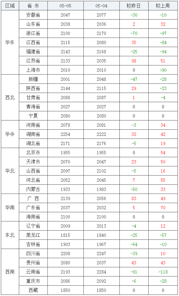 玉米均价(15%水分)后五:黑龙江省1815元/吨、西藏自治区1850元/吨、吉林省1903元/吨、内蒙古自治区1933元/吨、北京市1955元/吨。