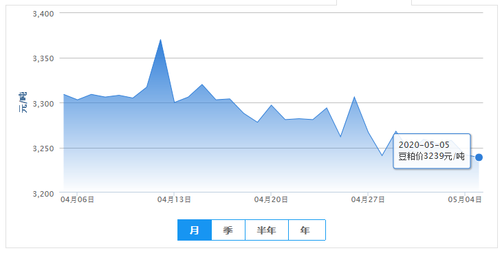 2020年05月05日,今日全国豆粕均价为3239元/吨,较昨日下跌3元/吨。今年4月我国由于受到检修和断豆潮影响,油厂停机时间不断延长,各家油厂停机时间都在15天以上,个别油厂停机时间长达月余。