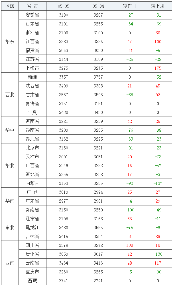 豆粕均价(43%蛋白)后五:西藏自治区2741元/吨、广东省2977元/吨、广西壮族自治区3019元/吨、贵州省3059元/吨、福建省3063元/吨。