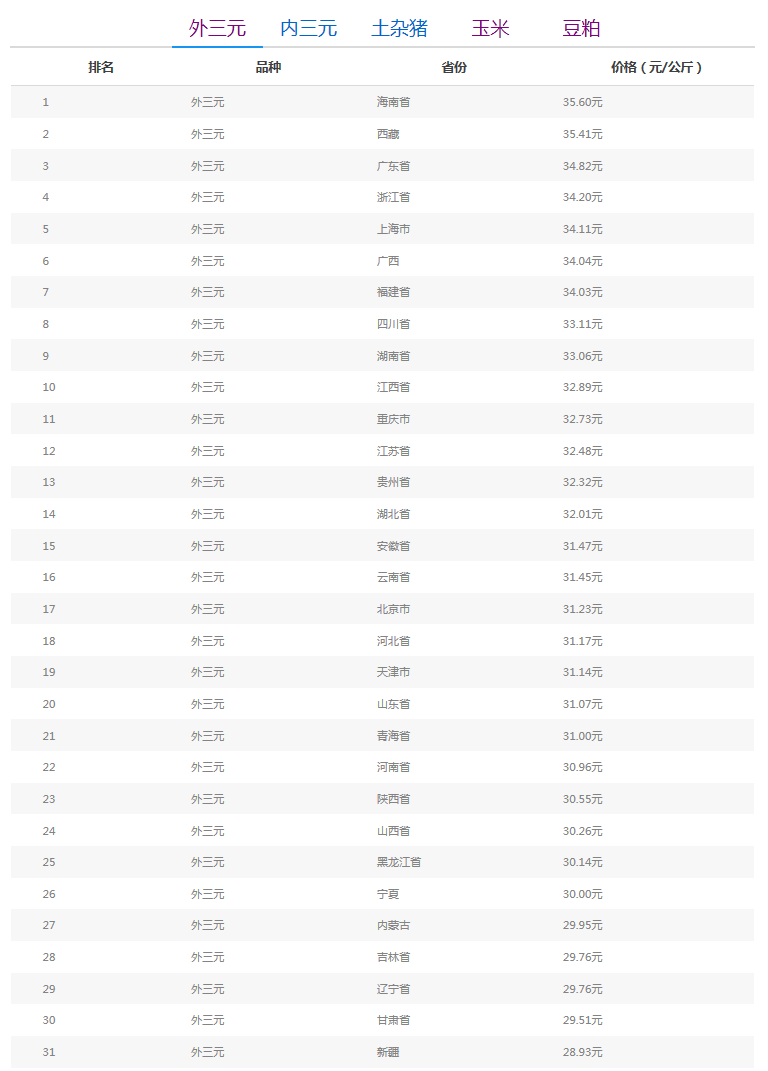 活猪价格排名前三的地区:海南省、西藏自治区、广东省。