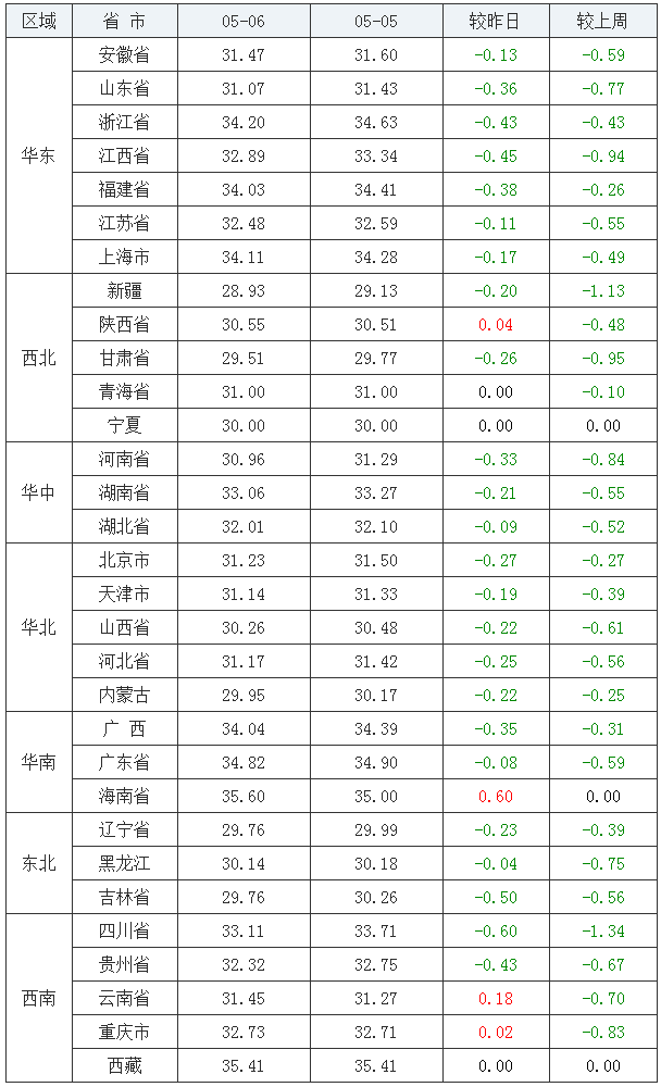全国生猪均价(外三元)为31.82元/公斤,价格较昨日下跌0.22元/公斤;内三元生猪均价为30.91元/公斤,价格较昨日下跌0.23元/公斤;土杂猪生猪均价为30.38元/公斤,价格较昨日下跌0.16元/公斤。