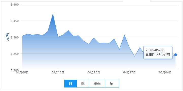 2020年05月06日,今日全国豆粕均价为3246元/吨,较昨日上涨7元/吨。随着近两个月我国采购的巴西大豆陆续到港,国内进口大豆中远期供应形势将明显好转,目前大豆供应形势转向宽松,豆粕行情仍有回落风险。