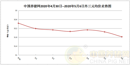2020年5月6日(星期三),据中国养猪网猪价系统监测全国外三元均价为31.82元/公斤,价格较昨日下跌0.22元/公斤,较上周下跌0.74元/公斤。国内行情在4日少许反弹后又再度出现下调。