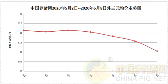 2020年5月8日(星期五),据中国养猪网猪价系统监测全国外三元均价为31.05元/公斤,价格较昨日下跌0.52元/公斤,较上周下跌1.14元/公斤。猪价跌势愈发越烈,今日跌势较昨日有显著加速,即将跌破31元跌至30元/公斤。