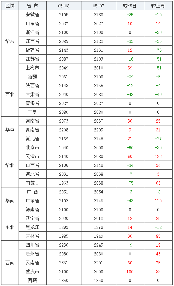 玉米均价(饲料原料)后五:西藏自治区1850元/吨、黑龙江省1893元/吨、内蒙古自治区1963元/吨、北京市1940元/吨、吉林省1985元/吨。