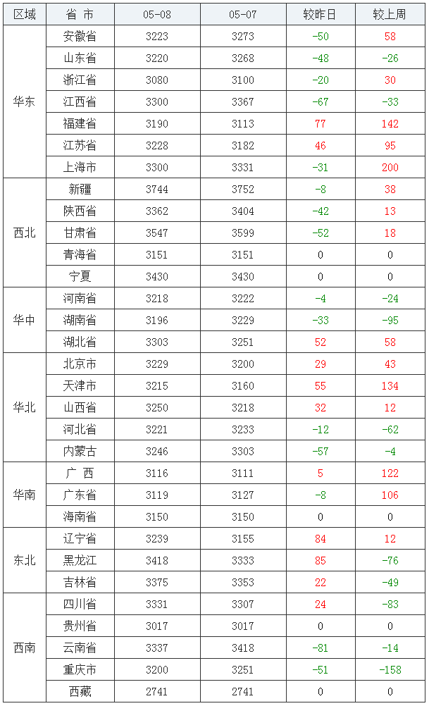 豆粕均价(饲料原料)前五:新疆维吾尔自治区3744元/吨、甘肃省3547元/吨、宁夏回族自治区3430元/吨、黑龙江省3418元/吨、吉林省3375元/吨。