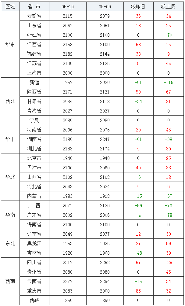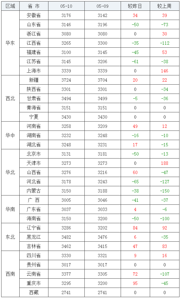 玉米均价(饲料原料)后五:西藏自治区1850元/吨、吉林省1920元/吨、北京市1940元/吨、黑龙江省1953元/吨、新疆维吾尔自治区1959元/吨。