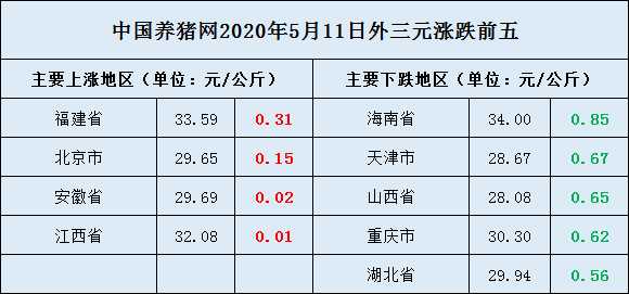 今日我国猪价上涨最多的地区:福建省,较昨日上涨0.31元/公斤。