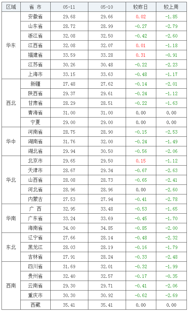 全国生猪均价(外三元)为30.05元/公斤,价格较昨日下跌0.32元/公斤;内三元生猪均价为29.10元/公斤,价格较昨日下跌0.30元/公斤;土杂猪生猪均价为28.57元/公斤,价格较昨日下跌0.29元/公斤。