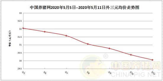 2020年5月11日(星期一),据中国养猪网猪价系统监测全国外三元均价为30.05元/公斤,价格较昨日下跌0.32元/公斤,较上周下跌2.08元/公斤。通过以上价格我们可以发现,猪价在5月8日的31.05元/公斤到今日,仅用了3天时间就下跌了1元/公斤,可见猪价下跌速度有多快。按照如此“规律”,跌破30元/公斤也许就在明天。