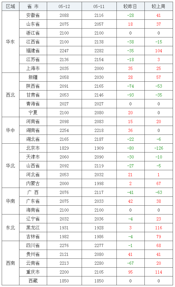 玉米均价(饲料原料)后五:北京市1829元/吨、西藏自治区1850元/吨、黑龙江省1931元/吨、吉林省1982元/吨、内蒙古自治区2000元/吨。