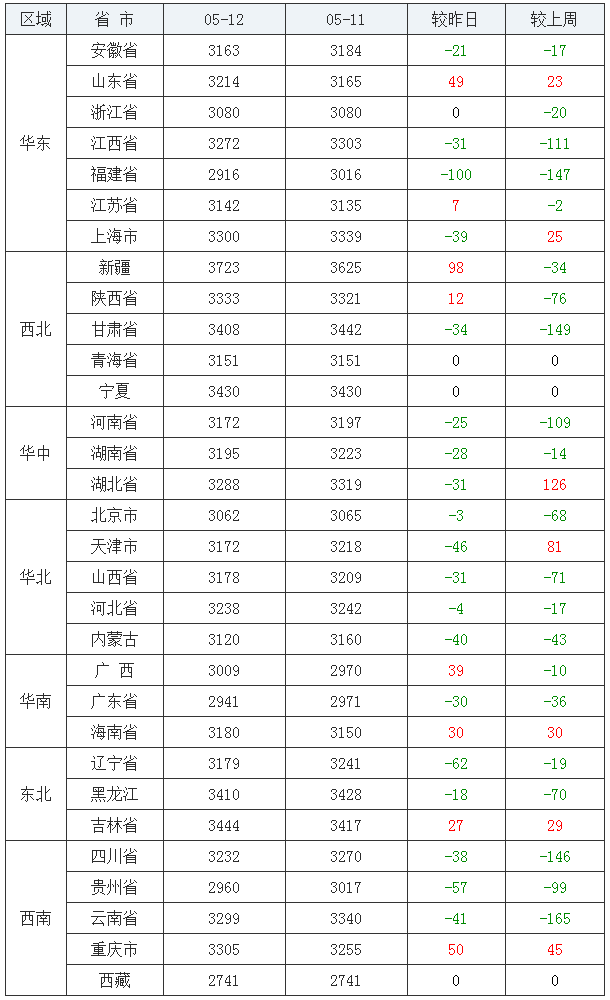 豆粕均价(饲料原料)前五:新疆维吾尔自治区3723元/吨、吉林省3444元/吨、宁夏回族自治区3430元/吨、黑龙江省3410元/吨、甘肃省3408元/吨;