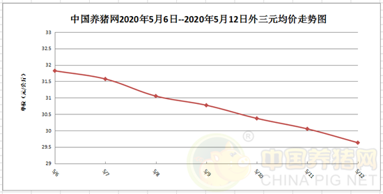 2020年5月12日(星期二),据中国养猪网猪价系统监测全国外三元均价为29.63元/公斤,价格较昨日下跌0.42元/公斤,较上周下跌2.41元/公斤。如我们昨日预料一致,今日国内生猪均价“如约而至”地跌破30元,正式跌至29元/公斤左右。