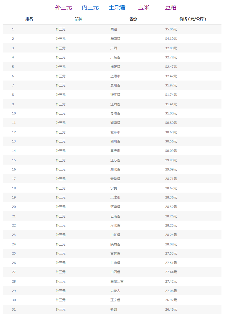 活猪价格排名前三的地区:西藏自治区、海南省、福建省。