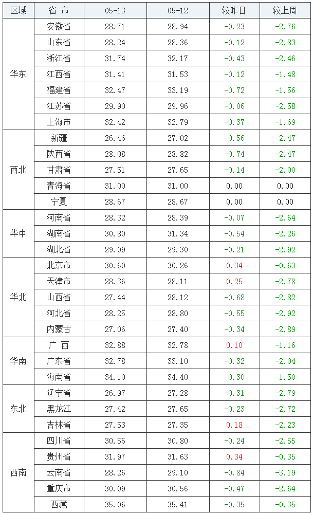 全国生猪均价(外三元)为29.35元/公斤,价格较昨日下跌0.28元/公斤;内三元生猪均价为28.41元/公斤,价格较昨日下跌0.36元/公斤;土杂猪生猪均价为27.86元/公斤,价格较昨日下跌0.33元/公斤。
