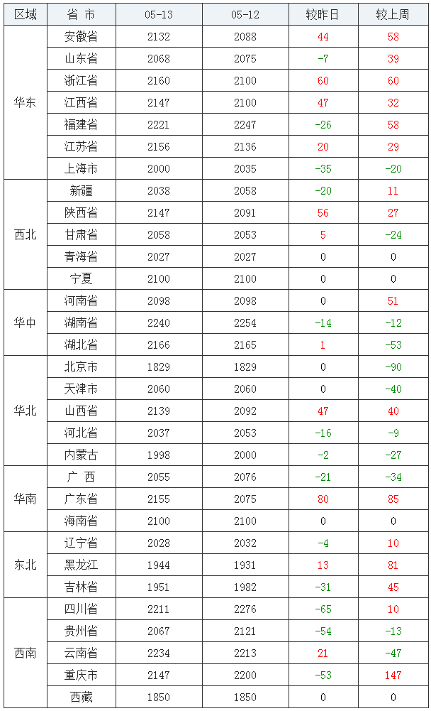 玉米均价(饲料原料)后五:北京市1829元/吨、西藏自治区1850元/吨、黑龙江省1944元/吨、吉林省1951元/吨、内蒙古自治区1998元/吨。