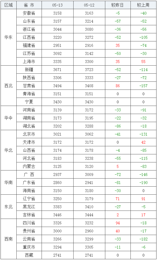 豆粕均价(饲料原料)前五:新疆维吾尔自治区3671元/吨、甘肃省3494元/吨、吉林省3446元/吨、宁夏回族自治区3430元/吨、黑龙江省3383元/吨;
