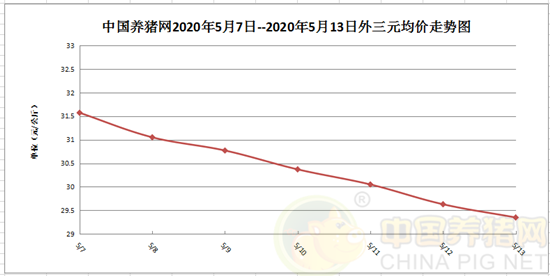 2020年5月13日(星期三),据中国养猪网猪价系统监测全国外三元均价为29.35元/公斤,价格较昨日下跌0.28元/公斤,较上周下跌2.47元/公斤。从走势来看,猪价跌势犹如“飞流直下”,依旧保持着它下跌的步伐,无法阻挡。