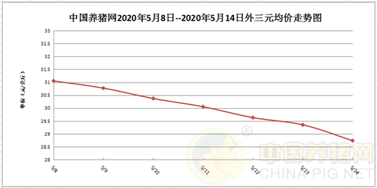 2020年5月14日(星期四),据中国养猪网猪价系统监测全国外三元均价为28.74元/公斤,价格较昨日下跌0.61元/公斤,较上周下跌2.83元/公斤。从猪价近期走势来看,今日猪价下跌趋势创近日最大跌幅,下跌“无止境”。