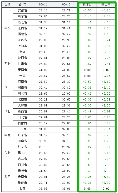 2020年05月14日(星期四),全国外三元生猪均价为28.74元/公斤,较昨日下跌0.61元/公斤,猪价连续下跌数月,今日更是全线暴跌,一片“绿光!