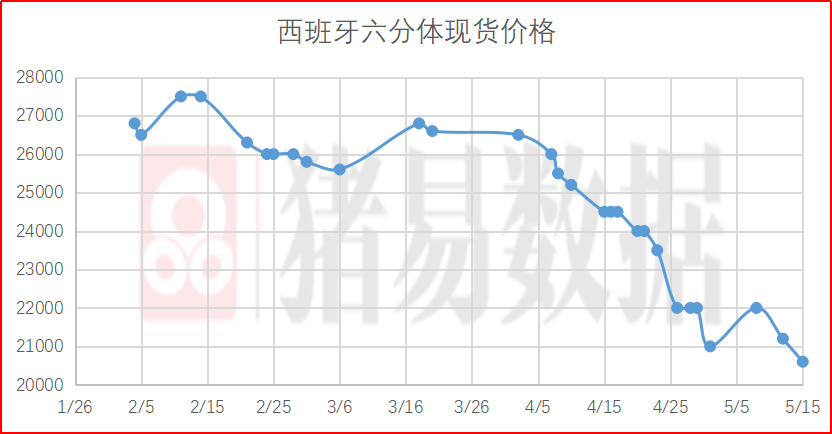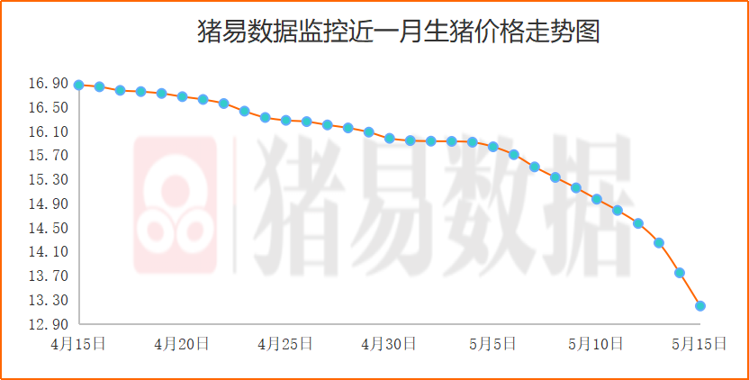 据猪易数据监测数据显示,2020年5月15日全国标准体重生猪平均价格为26.39元/公斤,较昨日下跌1.1元/公斤,跌幅为4.00%;较19年同期14.89元/公斤上涨11.50元/公斤,涨幅为77.23%;