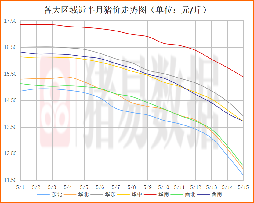 目前国内各大区域猪价差异化表现明显,华北、东北、华东、华南、西南、西北、华中地区猪价呈现下跌态势,整体猪价呈现快速下跌走势,猪价整体跌幅未见明显放缓,东北地区有抗价惜售现象,局部地区有反弹现象。