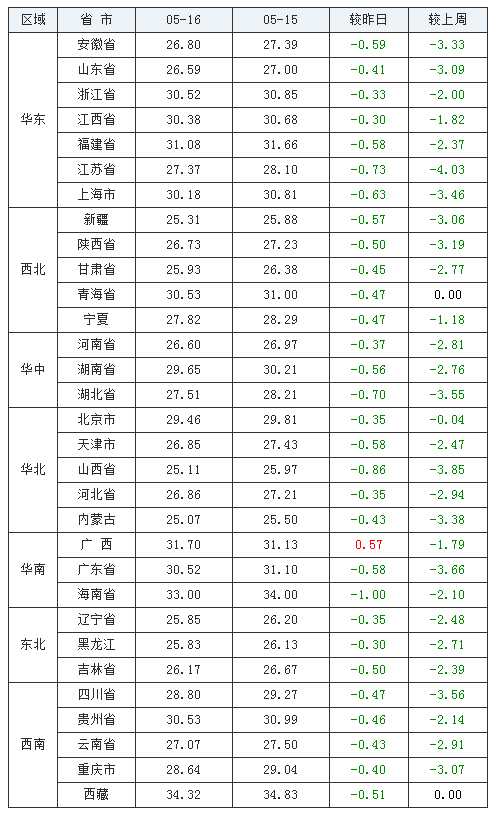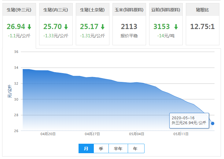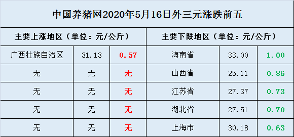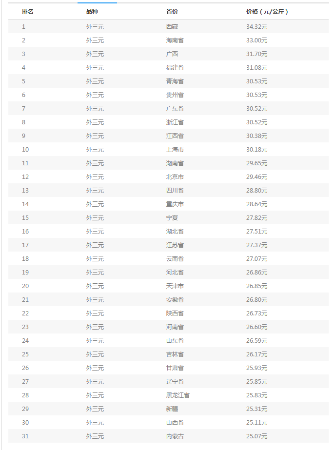 今日猪价最高地区为西藏自治区34.32元/公斤,猪价最低地区为内蒙古自治区25.07元/公斤。根据外三元均价排行表可知,猪价一路下行,下跌幅度及下跌范围都有所增加,行情走势不容乐观!