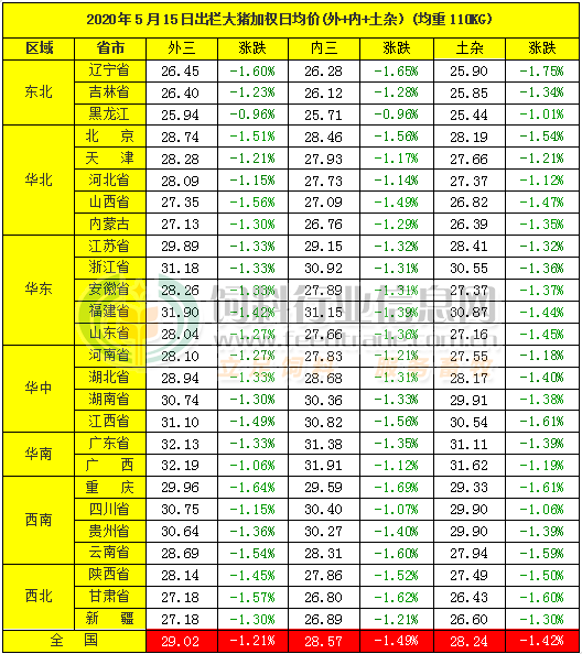 2. 主流市场内三元大猪全国销售均价28.57元每公斤,相比昨天下跌1.49%;
