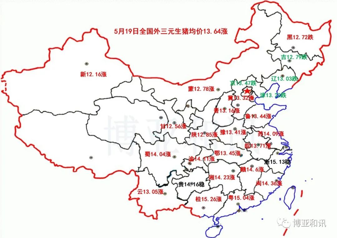 据博亚和讯监测,2020年5月19日全国外三元生猪均价为27.28元/公斤,较昨日上涨0.15元/公斤;仔猪均价为97.56元/公斤,较昨日下跌1.69元/公斤;白条肉均价35.74元/公斤,较昨日上涨1.78元/公斤。今日猪料比价为9.64,较昨日增加0.05。