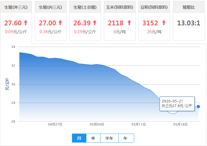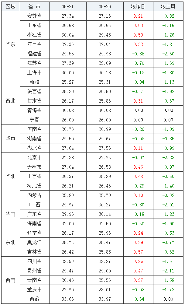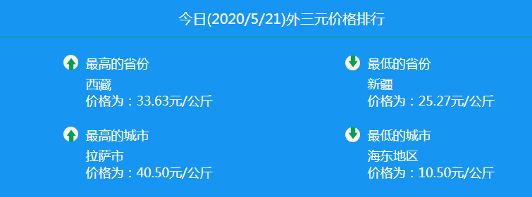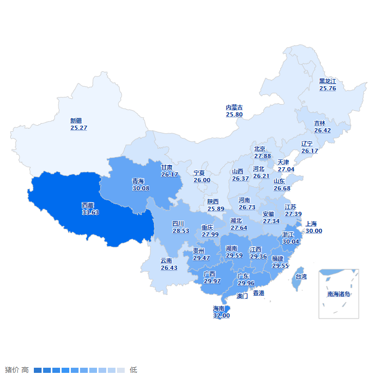 今日猪价最高地区为西藏自治区33.63元/公斤,猪价最低地区为新疆维吾尔自治区25.27元/公斤。综上可知,猪价最高省份与最低省份均有不同程度的下调。目前仅有5省份生猪均价在30元/公斤以上,其余地区均在30元/公斤以下。