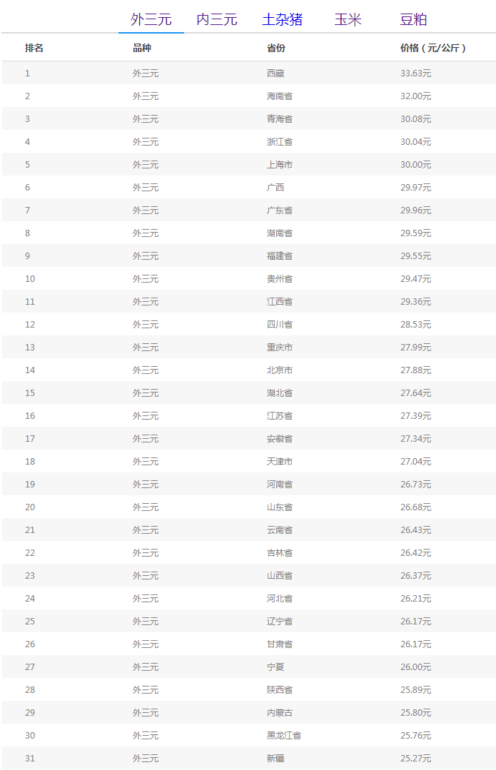 活猪价格排名前五的地区:西藏自治区、海南省、青海省、浙江省、上海市。