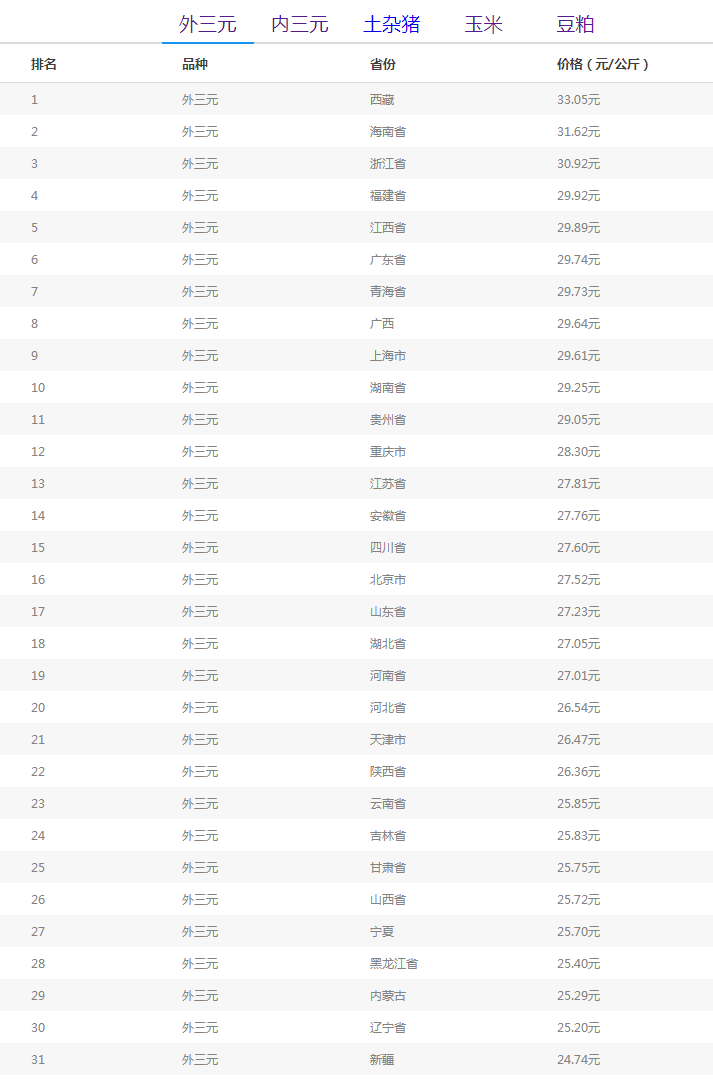 活猪价格排名后五的地区:新疆维吾尔自治区、内蒙古自治区、黑龙江省、宁夏回族自治区、山西省。