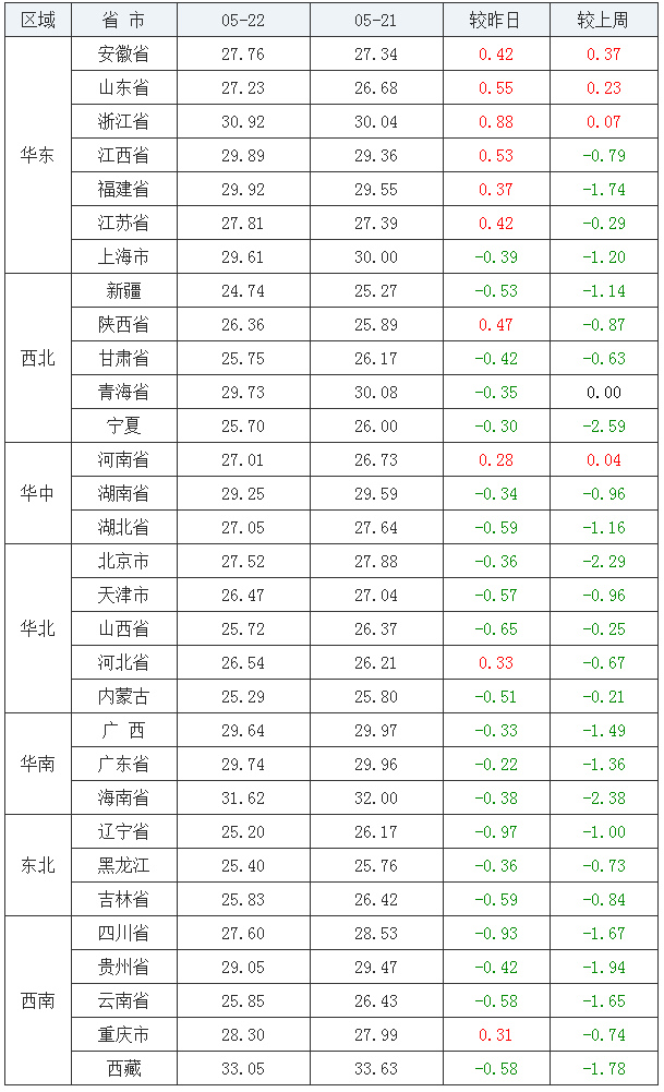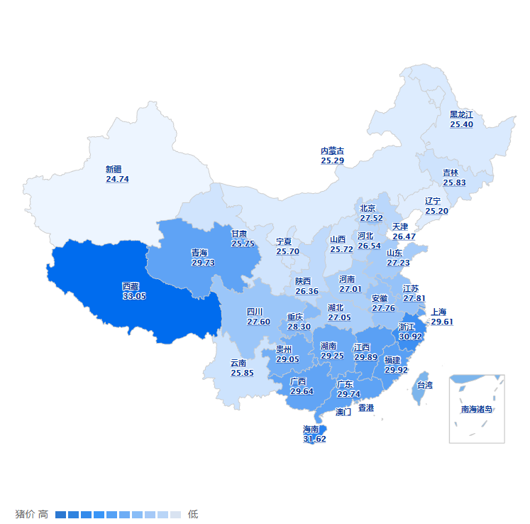今日猪价最高地区为西藏自治区33.05元/公斤,猪价最低地区为新疆维吾尔自治区24.74元/公斤。西藏与新疆再度开跌,行情一般,30元省份再度减少至3个,目前仅有西藏、海南、浙江维持在30元/公斤行情,其他地区生猪价格一律在下探。
