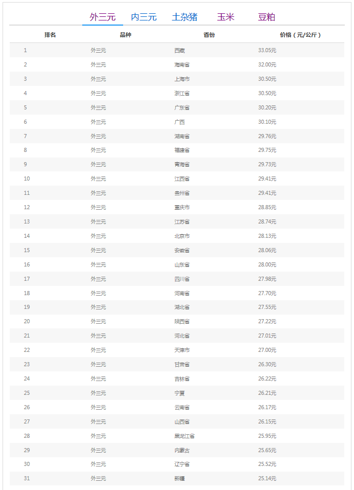 今日猪价最高地区为西藏自治区33.05元/公斤,猪价最低地区为新疆维吾尔自治区25.14元/公斤。今日西藏猪价跌势暂时“平息”,猪价最高位得到短时稳定;新疆追啊较昨日有上涨迹象,目前价位在“25元”,最低价也得到“保障”,目前我国猪价最高位和最低位价差较昨日有所减少!