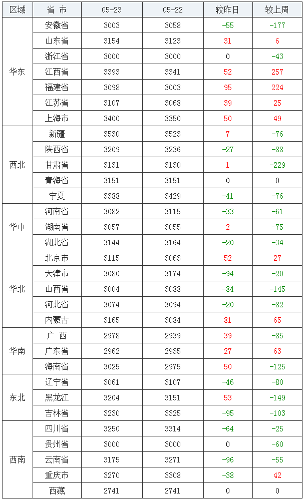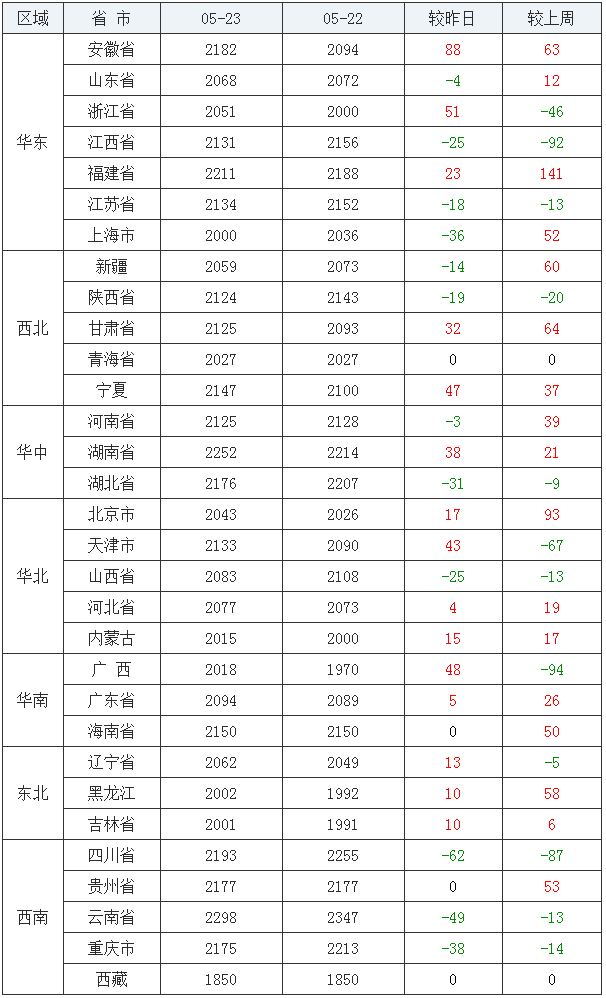 玉米均价(饲料原料)后五:西藏自治区1850元/吨、上海市2000元/吨、吉林省2001元/吨、黑龙江省2002元/吨、内蒙古自治区2015元/吨。