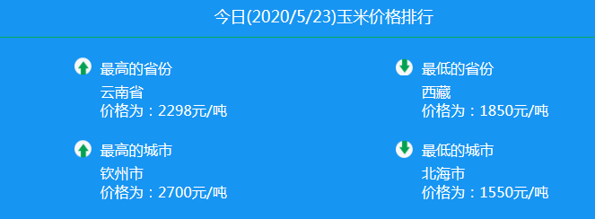 玉米均价(饲料原料)前五:云南省2298元/吨、湖南省2252元/吨、福建省2211元/吨、四川省2193元/吨、安徽省2182元/吨;