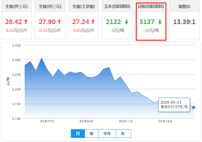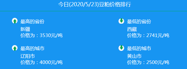 豆粕均价(饲料原料)前五:新疆维吾尔自治区3523元/吨、上海市3400元/吨、江西省3393元/吨、宁夏回族自治区3388元/吨、重庆市3270元/吨;