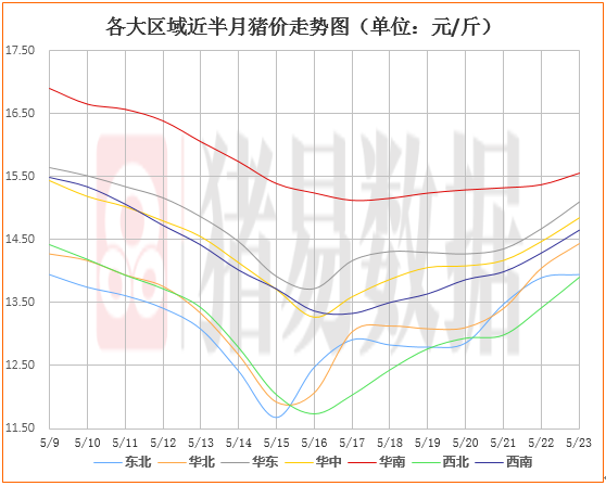 目前国内各大区域猪价差异化表现明显,东北、华北、华东、西北、华中、华南、西南地区猪价呈现上涨态势,整体猪价继续呈现大面积上涨态势,东北地区猪价开始出现由涨变跌现象。