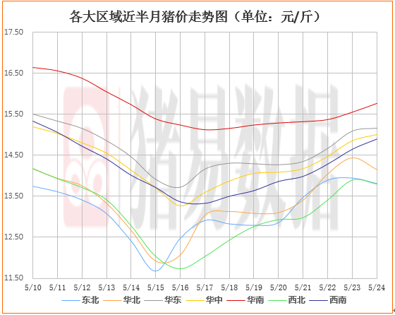 目前国内各大区域猪价差异明显减少,华东、华中、华南、西南地区猪价呈现上涨态势,东北、华北、西北地区猪价呈现下跌态势,整体猪价继续呈现微幅上涨态势。