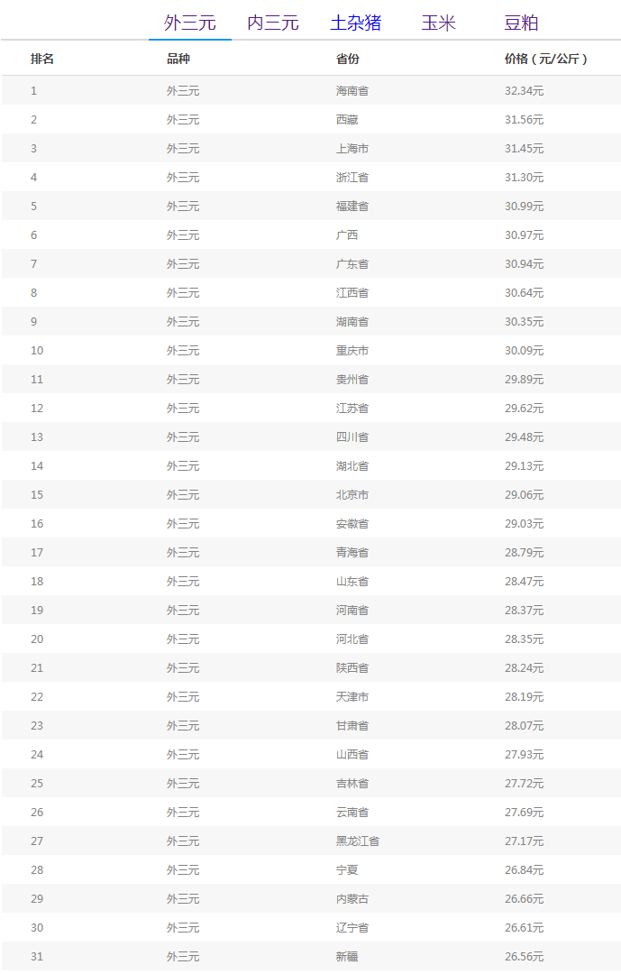 今日猪价下跌最高地区为:西藏自治区,外三元均价为31.56元/公斤,较昨日下跌1.00元/公斤。