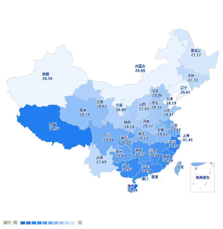 今日猪价最高地区为海南省32.34元/公斤,猪价最低地区为新疆维吾尔自治区26.56元/公斤。近期最低地区“换将”频繁,整体猪价依旧呈涨势,30元以上省份今日增至10个。