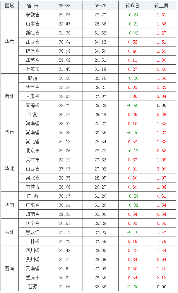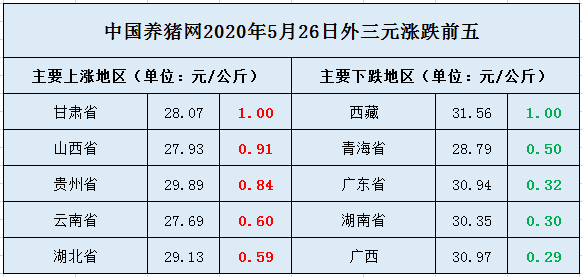 2020年05月26日(星期二),猪价系统数据监测如下: