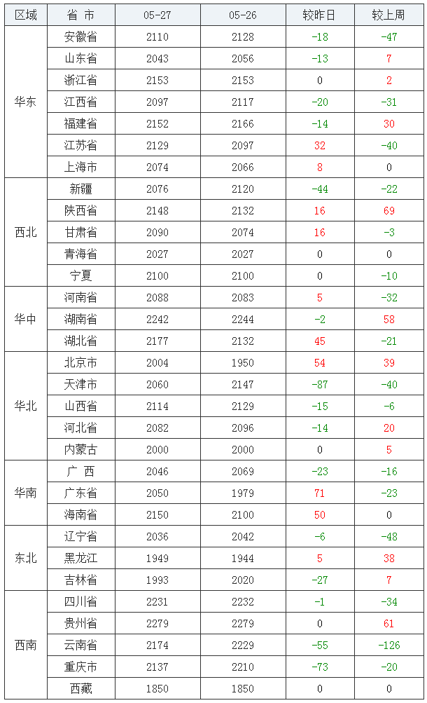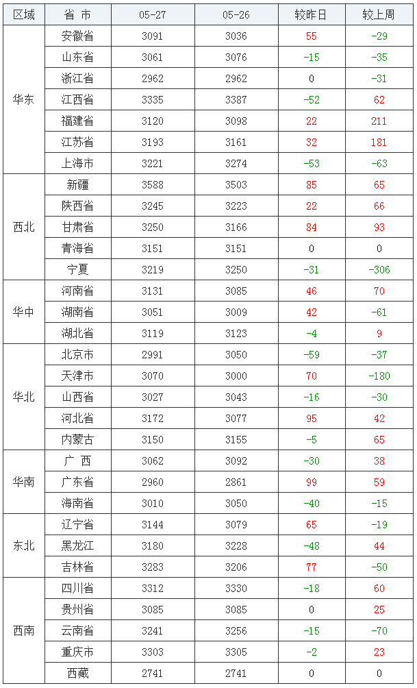 玉米均价(饲料原料)后五:西藏自治区1850元/吨、黑龙江省1949元/吨、吉林省1993元/吨、内蒙古自治区2000元/吨、北京市2004元/吨;