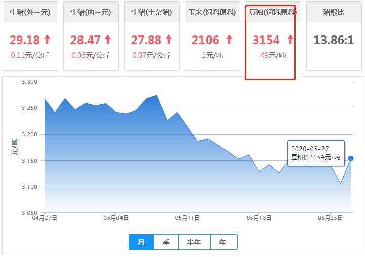 豆粕均价(饲料原料)前五:新疆维吾尔自治区3588元/吨、江西省3335元/吨、四川省3312元/吨、重庆市3303元/吨、吉林省3283元/吨;